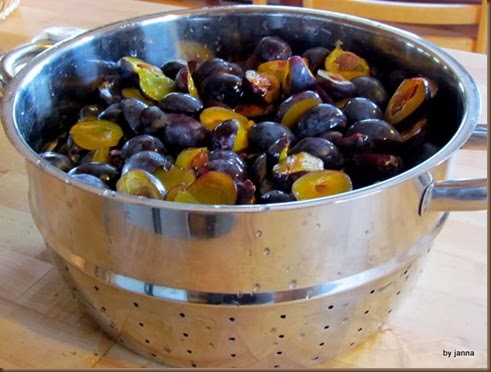 After the guys headed back up the hill for some more board sawing and nail pounding I began working on the plums—there are two trees behind our former home which would blossom but never produce fruit when we lived there. Tammy, who with her husband Joe now own that house was here a couple weeks ago and the trees were literally loaded with plums. Last summer Tammy gave the trees a major pruning, maybe that’s why they produced plums this year?? She gave me half of them—I’ve let them ripen in the cool basement.