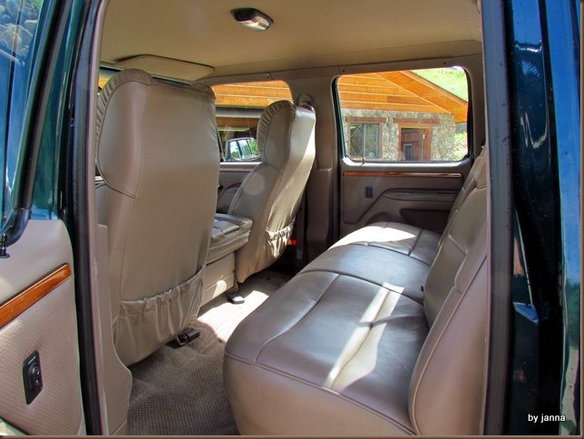 Last Monday this truck popped up on Craigslist—it’s a 1997 one ton, one owner with only 60,000 actual miles. The former owner used the truck to pull a large 5th wheel to Yuma, AZ and back to Montana every year—the rest of the time it was garaged. The guy who owned the truck ordered a basic Ford and then had it customized—thus the paint job and the upholstery.